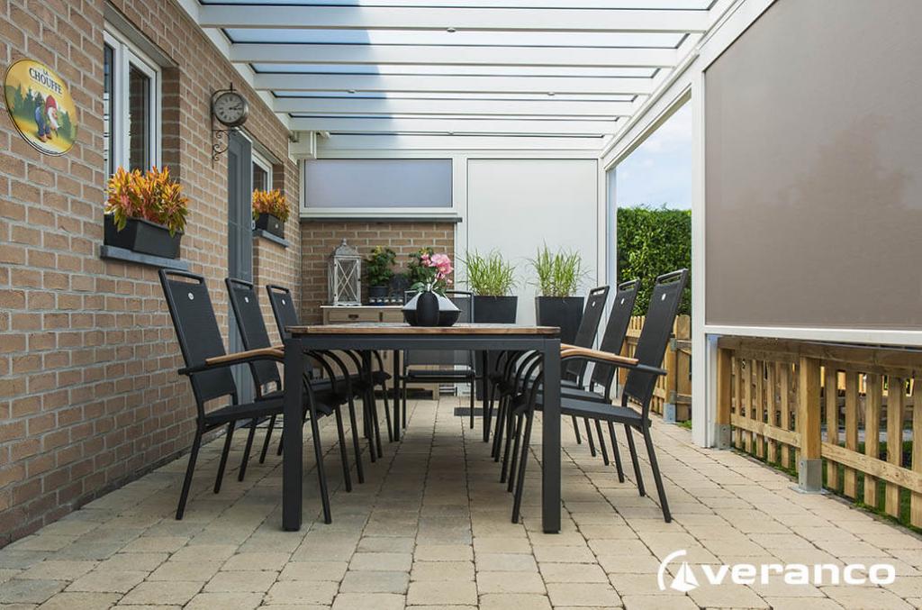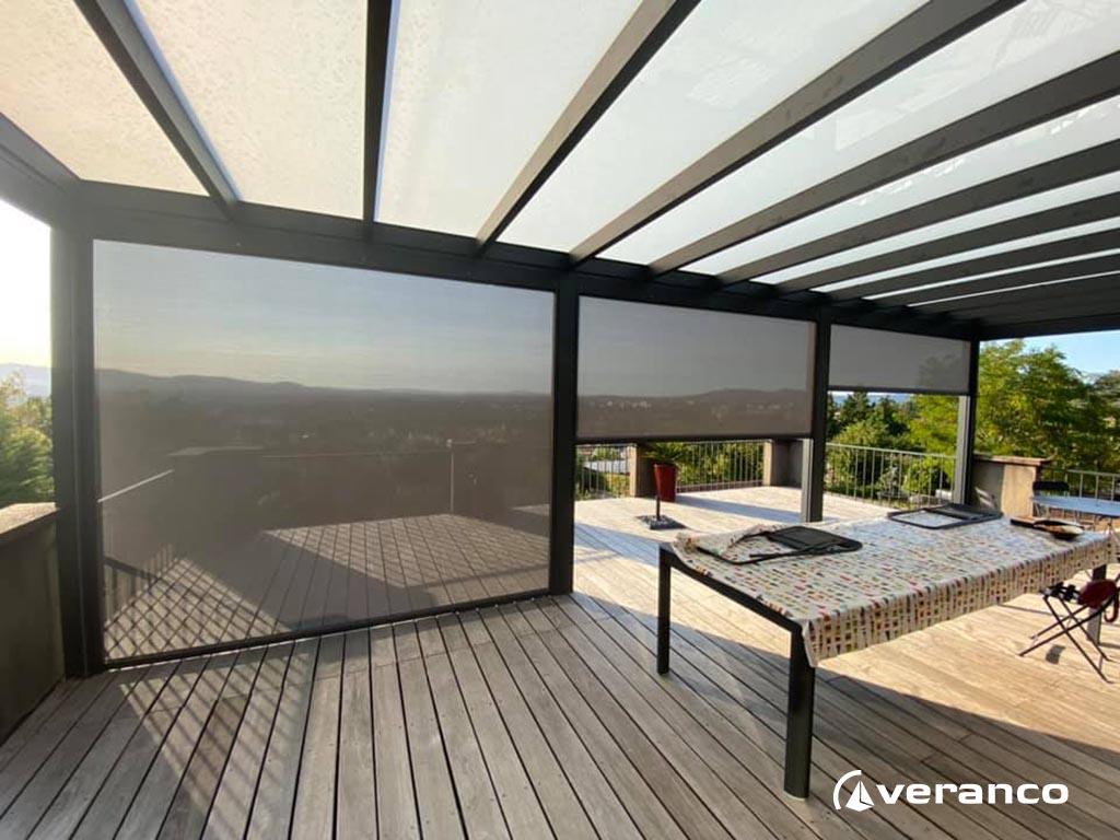 Son chéneau périphérique plat lui permet de recevoir tout naturellement des stores screens pour fermer partiellement ou entièrement cet espace. Idéale, par exemple, pour protéger un SPA des courants d'airs, des regards indiscrets et du soleil.